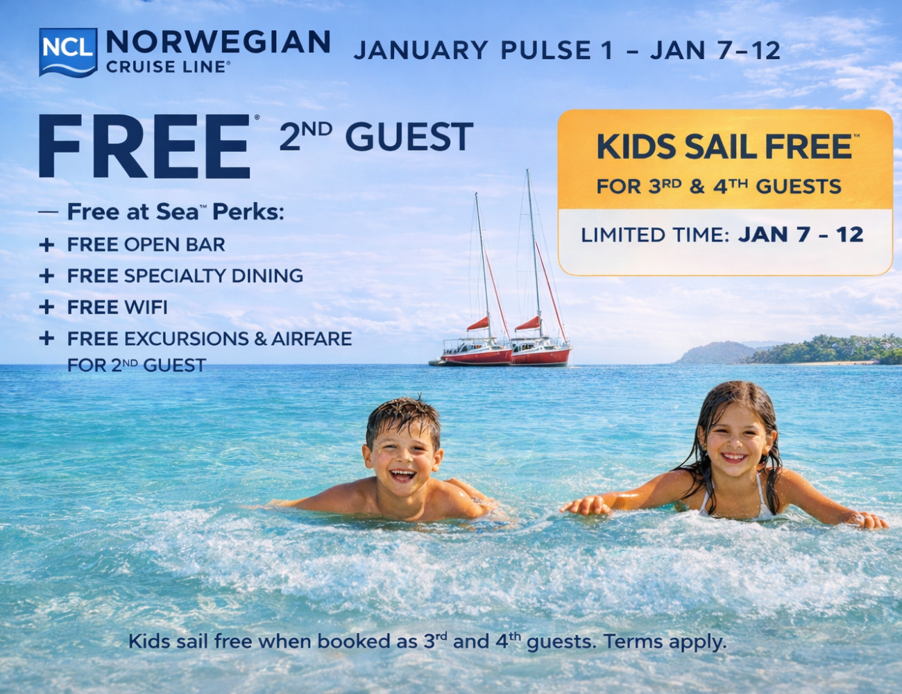 FREE 2nd Guest, Free at Sea perks (open bar, dining, Wi-Fi, excursions, airfare for 2nd guest) plus Kids Sail Free for 3rd & 4th guests. Limited time.